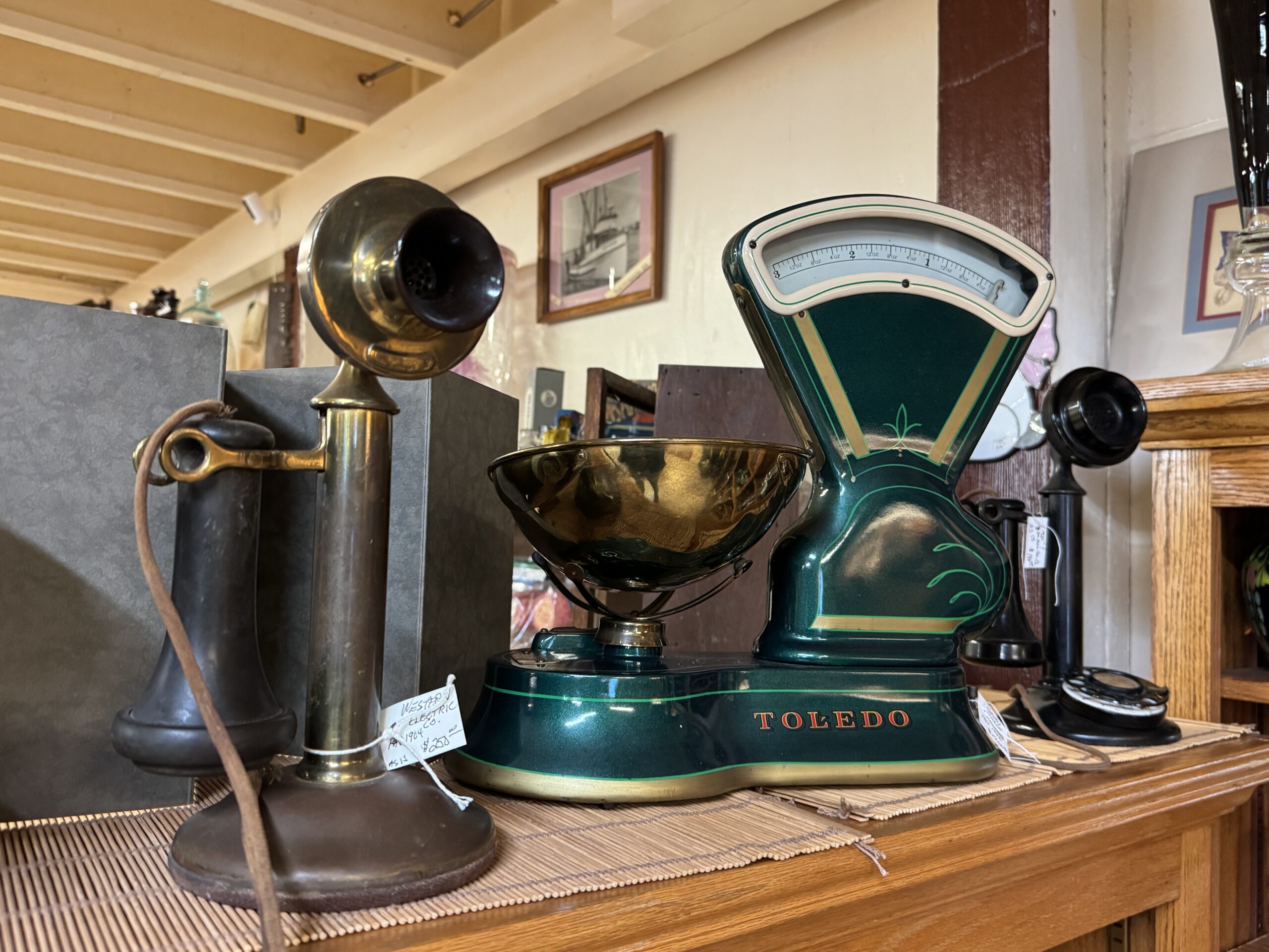 Antique TOLEDO Scales & Stick Telephones January 17, 2026 | by pdaadmin | Small $1250 Medium Patent Date 1906 $1800. Large Patent Date 1906 $1950 Telephones–Western Electric Patent 1904 $250 as is American Bell 1920’s?? $268 Share this post Twitter Facebook Google+ LinkedIn Pinterest Email Recommended for You Sea Shells 1990 Lighted BUDWEISER SIGN NOE SURO Pottery Dinnerware Made for Harrods Dept Store Vintage Stained Glass Windows
